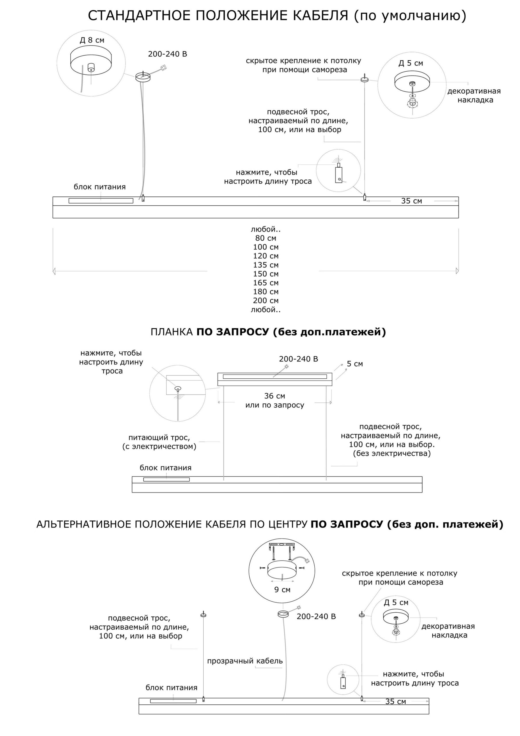 – светлый нейтральный свет (4000К) - Электропитание: от сети 100-240 Вольт. Подключение к проводу в потолке (см. схему). Шнур прозрачный (по умолчанию) / черный / белый, длина от 100 см